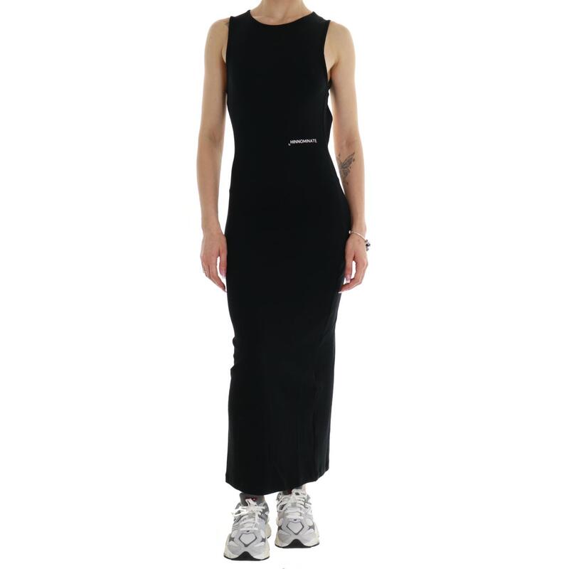 Vestito lungo a costine con schiena scoperta, logo frontale. Vestibilità slim.