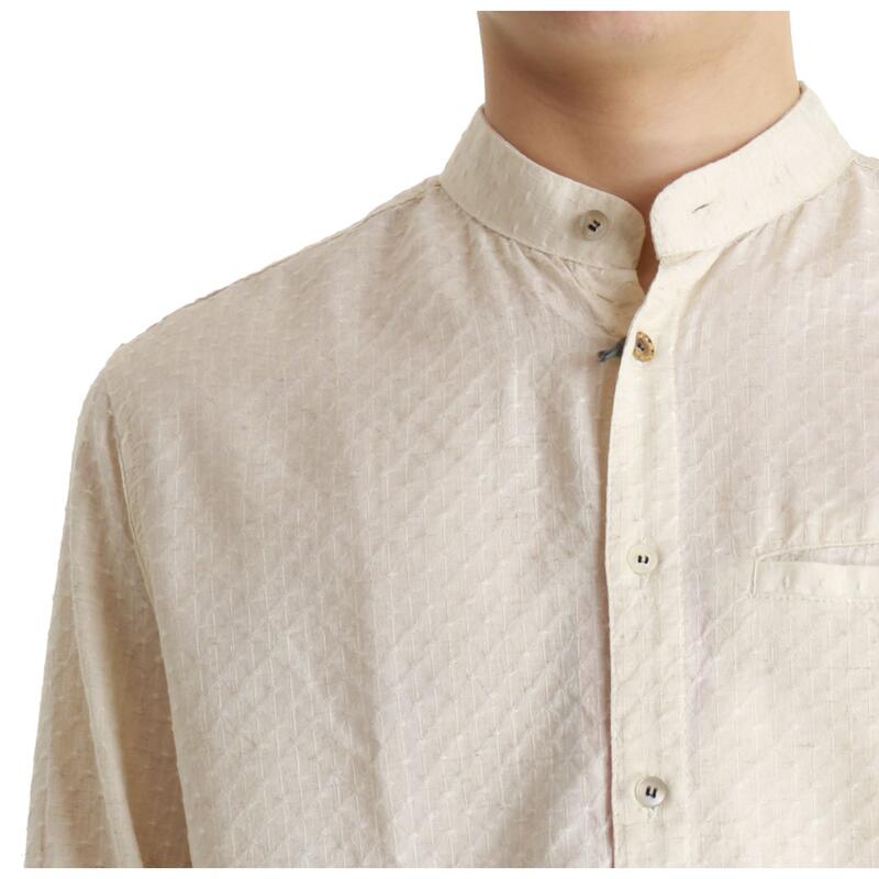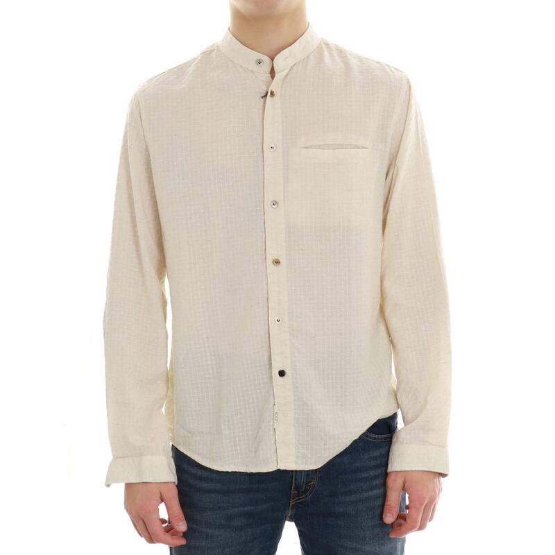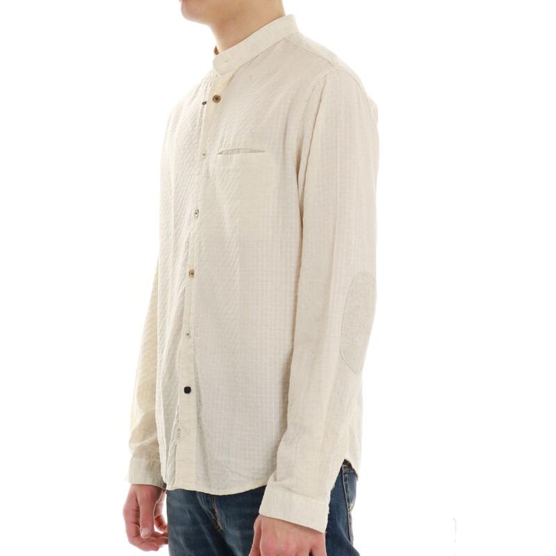 Camicia con collo alla coreana, fantasia, con taschino e toppe sui gomiti. Vestibilità regular.