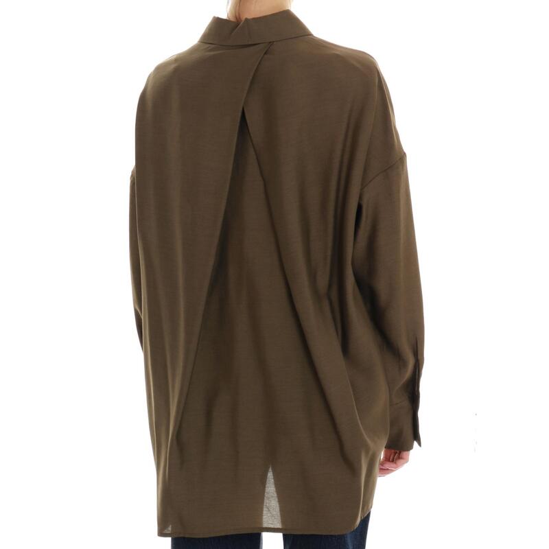 Camicia con nodo frontale, bottoni e colletto, più lunga dietro. Vestibilità over.