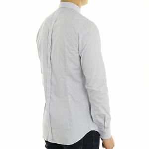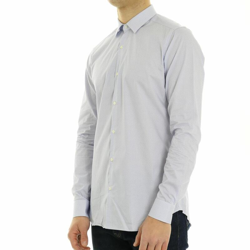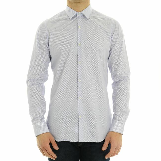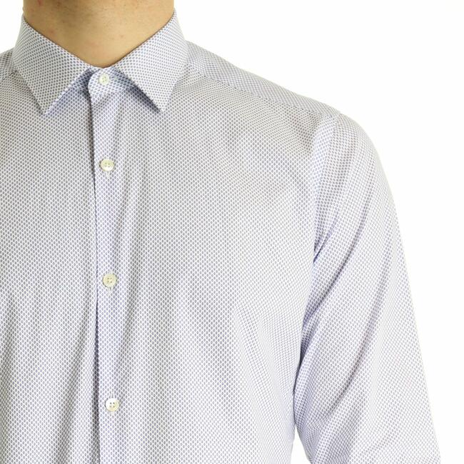 Camicia manica lunga, in microfantasia a pois stampata, collo inglese, pinces. Vestibilità super slim.