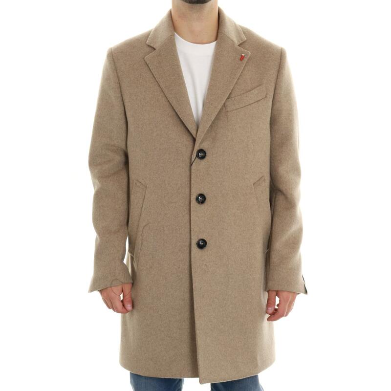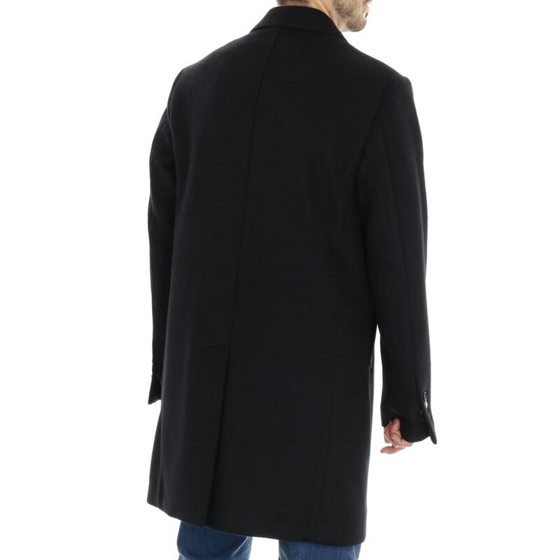 Cappotto in misto lana monopetto, chiusura tre bottoni, rever classico. Vestibilità regular.