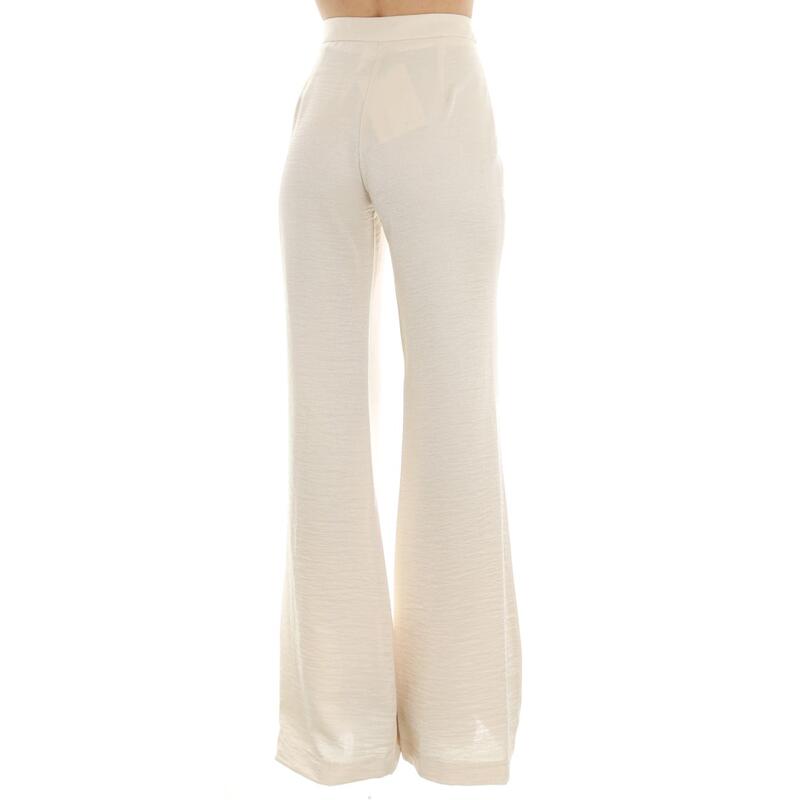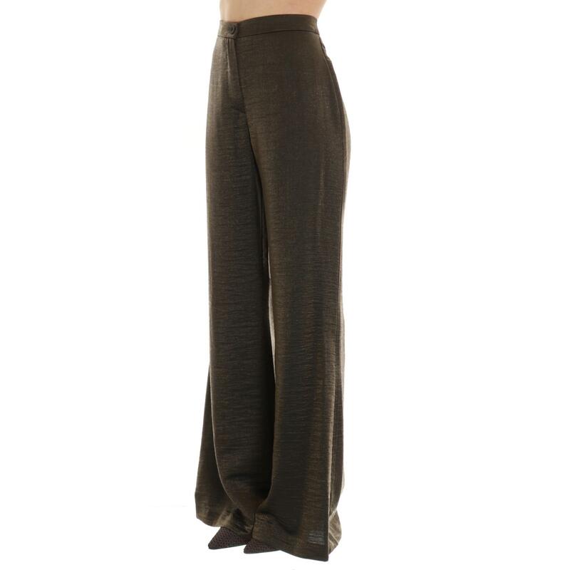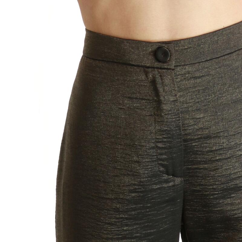 Pantalone a palazzo in tessuto laminato, chiusura con bottone foderato e zip. Vestibilità regular.