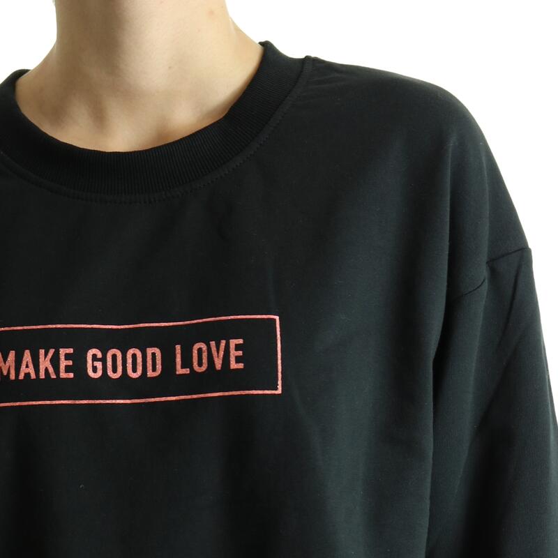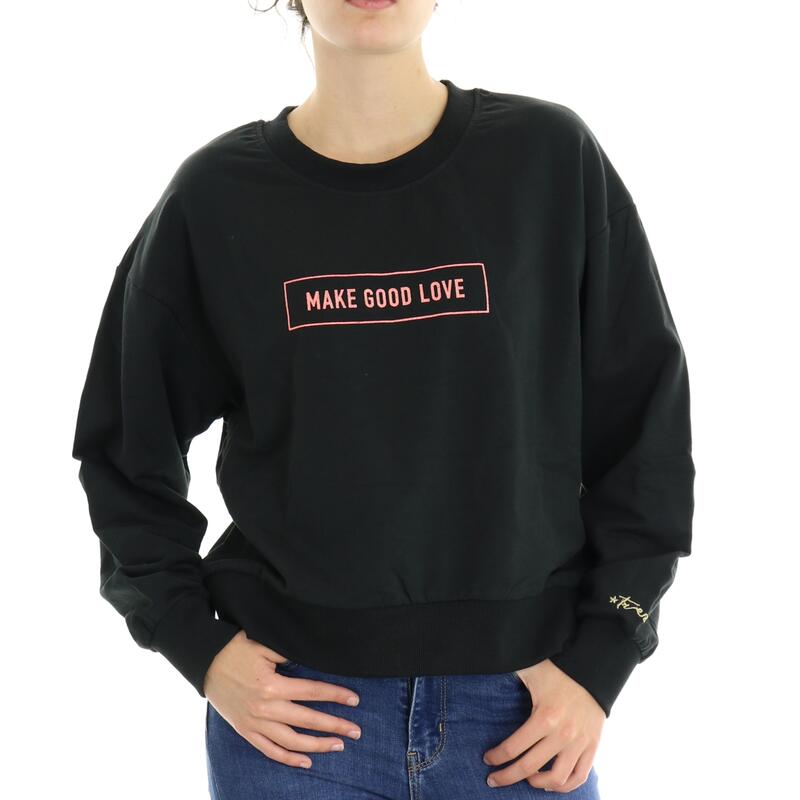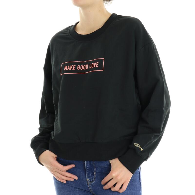 Felpa girocollo, tinta unita, stampa frontale, spalla calata. Vestibilità regular.