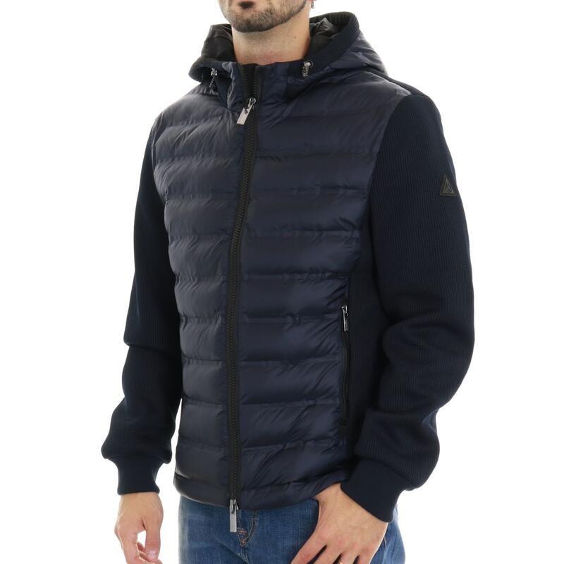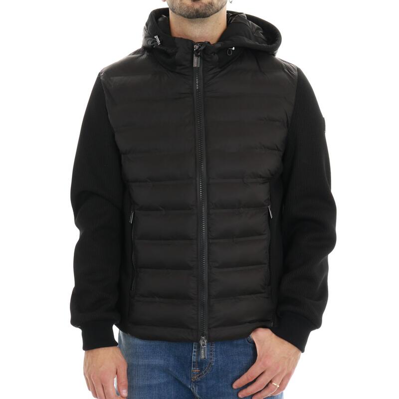 Giubbotto imbottito in ecopiuma con cappuccio, modello combinato con inserti in maglia. Vestibilità regular.