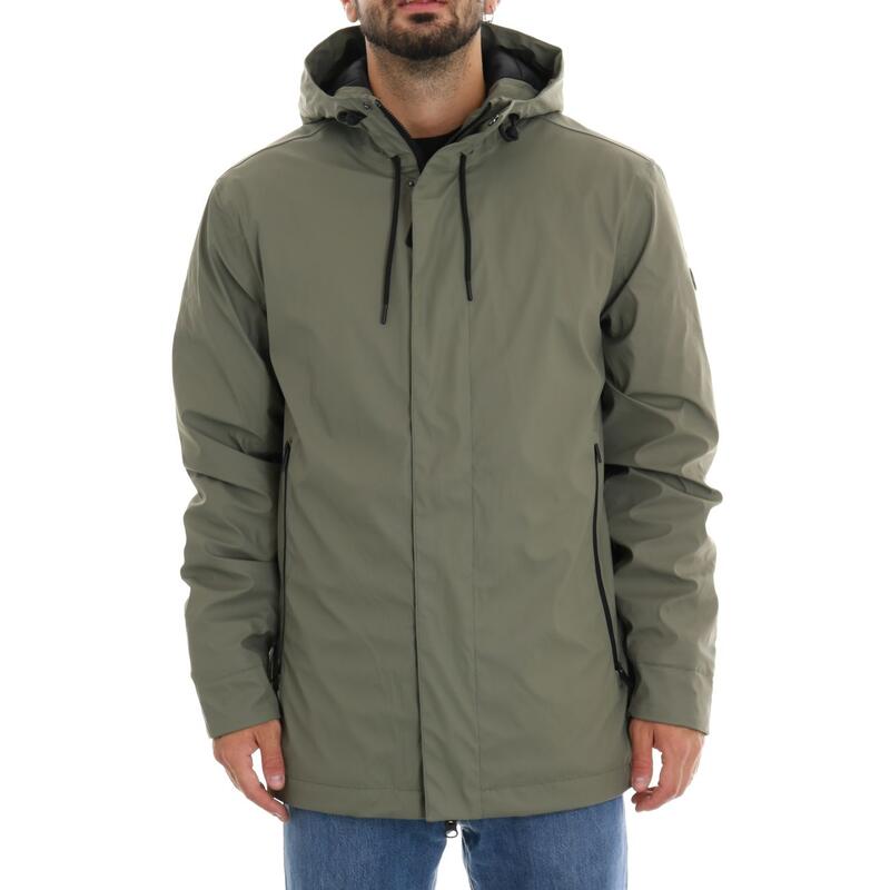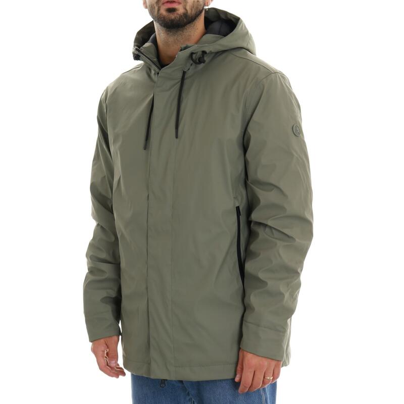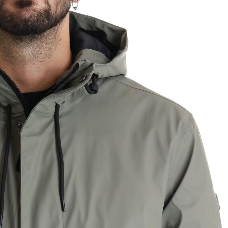 Giubbotto impermeabile con cappuccio fisso, imbottito in ecopiuma, zip coperta. Vestibilità regular.