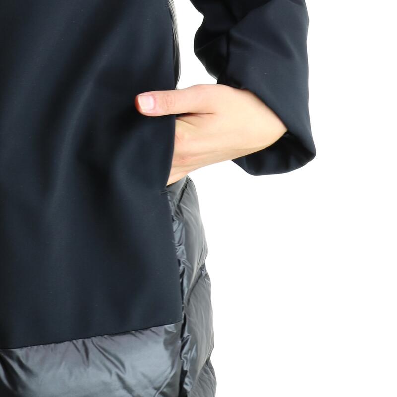 Piumino con cappuccio in tessuto tecnico stretch, impermeabile, traspirante, pelliccia staccabile, inserti in nylon con filze, zip frontale doppio cursore, modello svasato. Vestibilità slim.