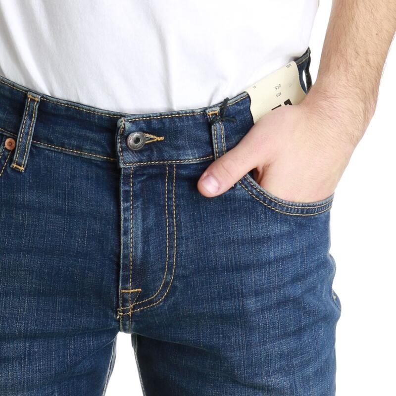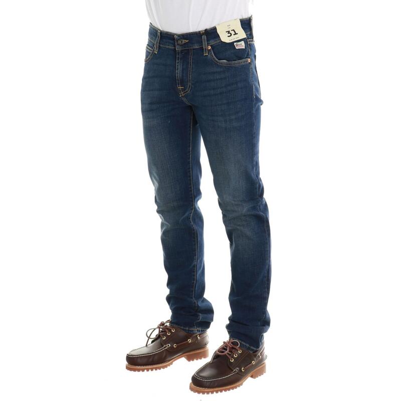 Jeans stretch lavaggio scuro, vita media, salpa a contrasto, chiusura con bottone e zip. Vestibilità slim.