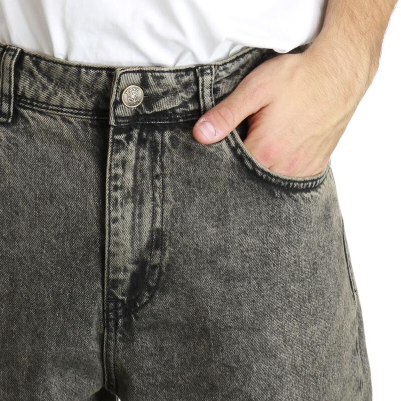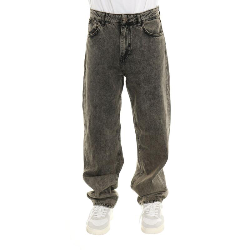 Jeans non stretch lavaggio grigio, vita media, chiusura con zip e bottone, gamba morbida. Vestibilità relaxed.