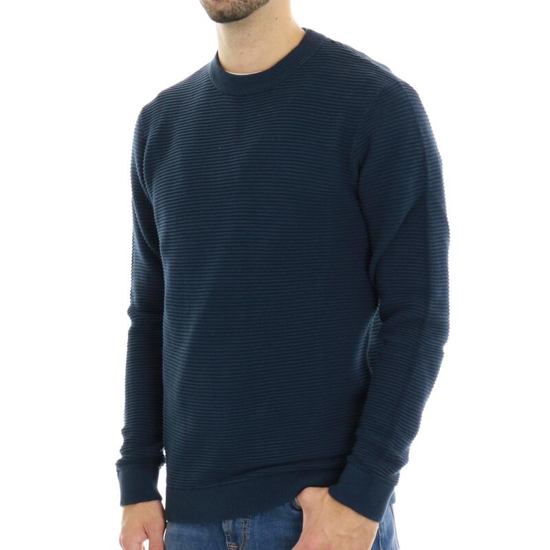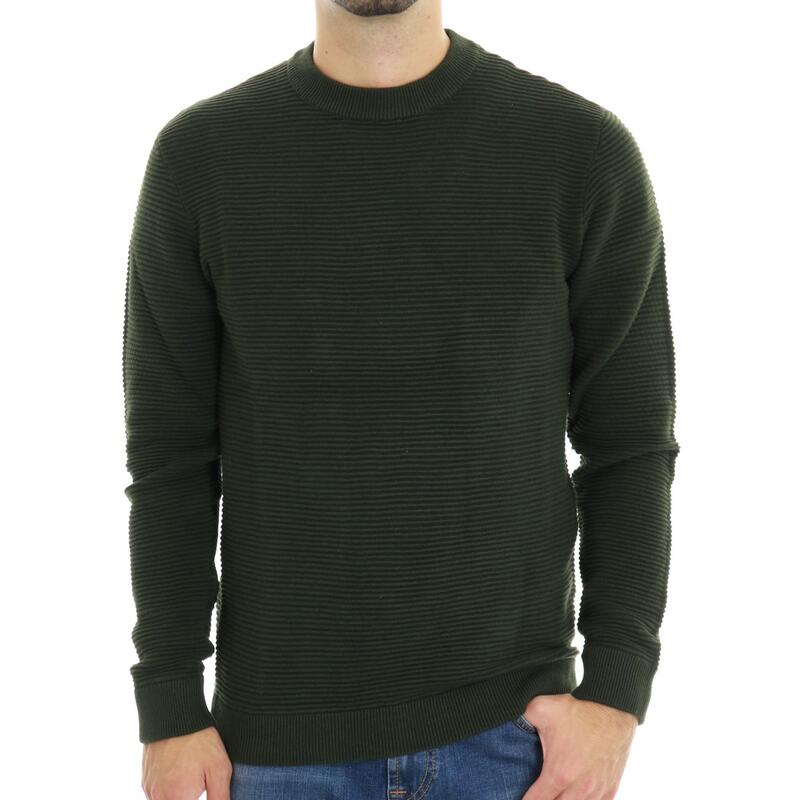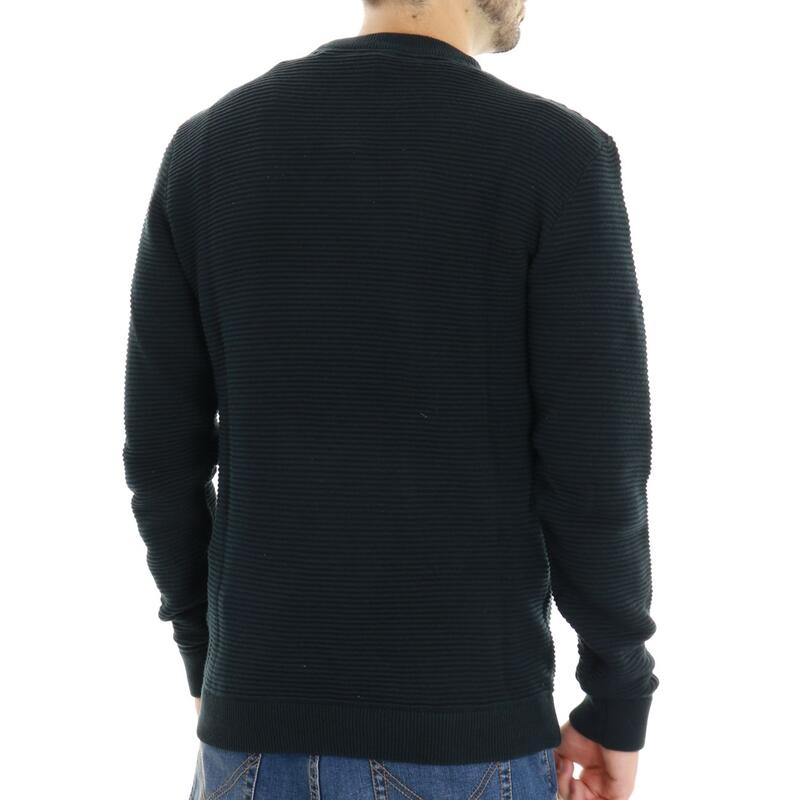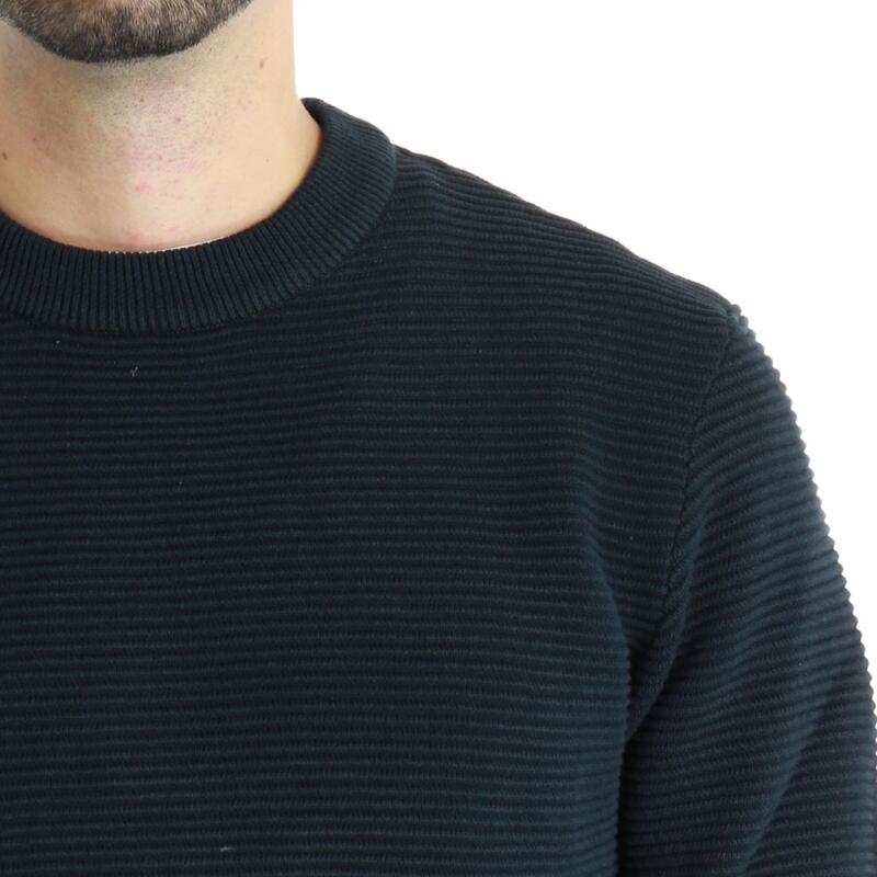 Maglia girocollo in tinta unita, lavorazione in rilievo ottoman, polsini e balza in fondo. Vestibilità slim.