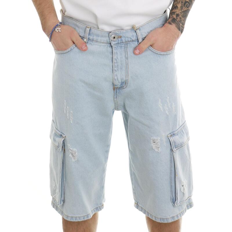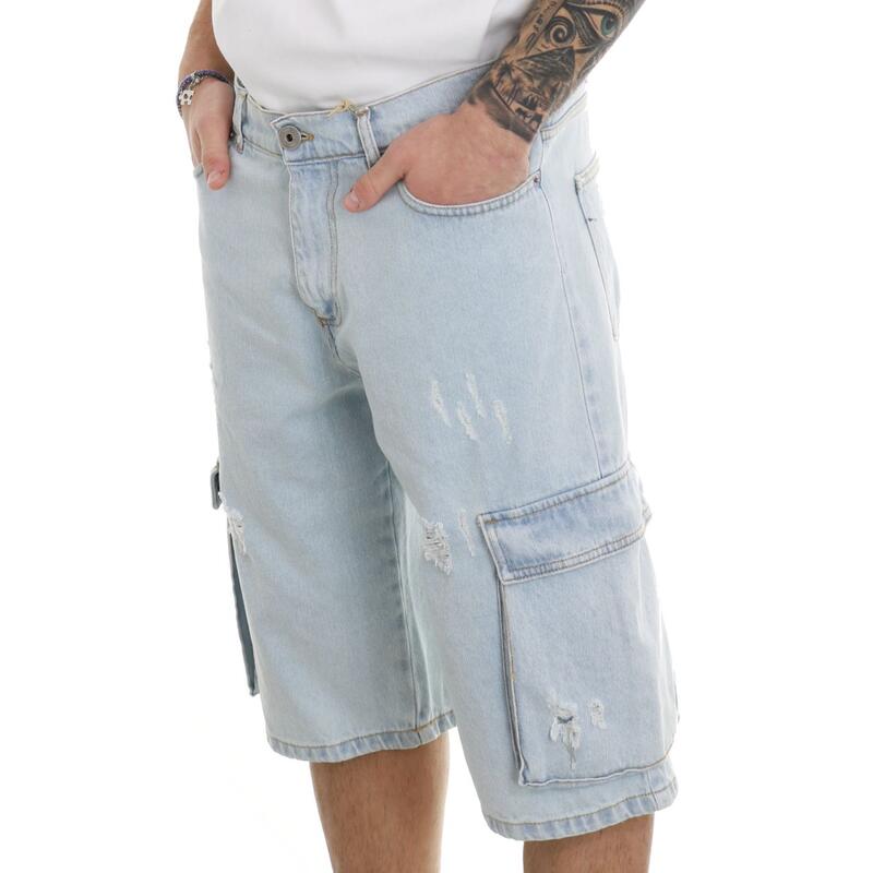 Jeans corto non stretch lavaggio chiaro con rotture, tasche laterali. Vestibilità regular.