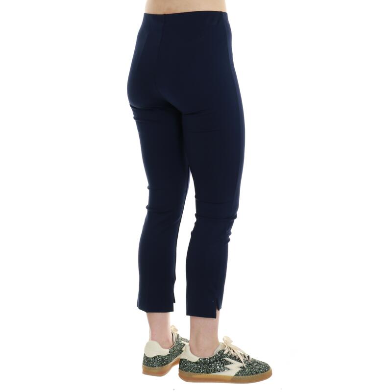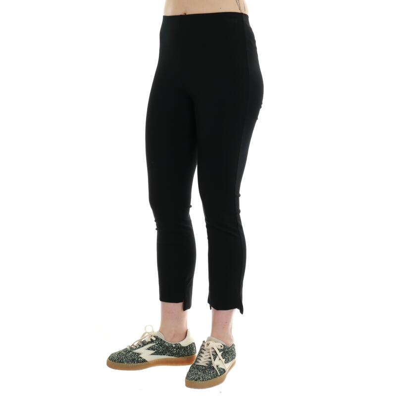 Pantalone in punto milano tinta unita, vita alta, stretch, più corto davanti, alla caviglia. Vestibilità slim.