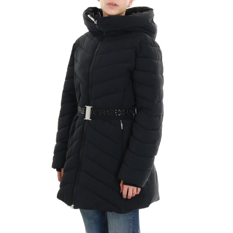Giubbotto imbottito in ecopiuma, stretch, cintura elastica logata in vita. Vestibilità regular.