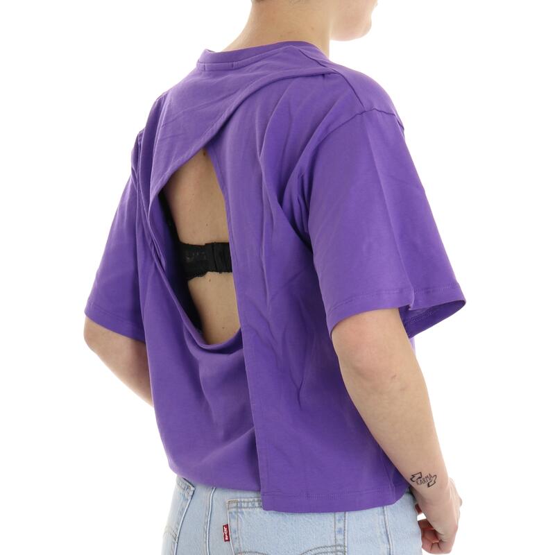 T-shirt mezza manica con logo frontale stampato, incrocio dietro con apertura. Vestibilità regular.