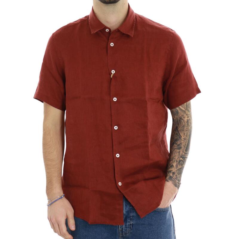 Camicia a manica corta con collo inglese, con pinces. Vestibilità regular.