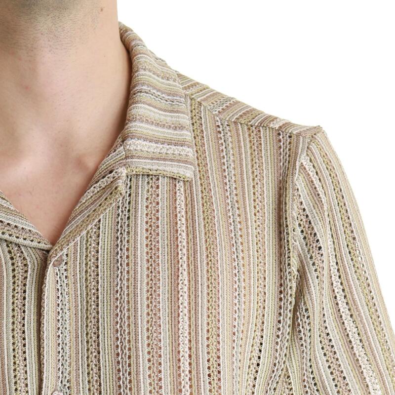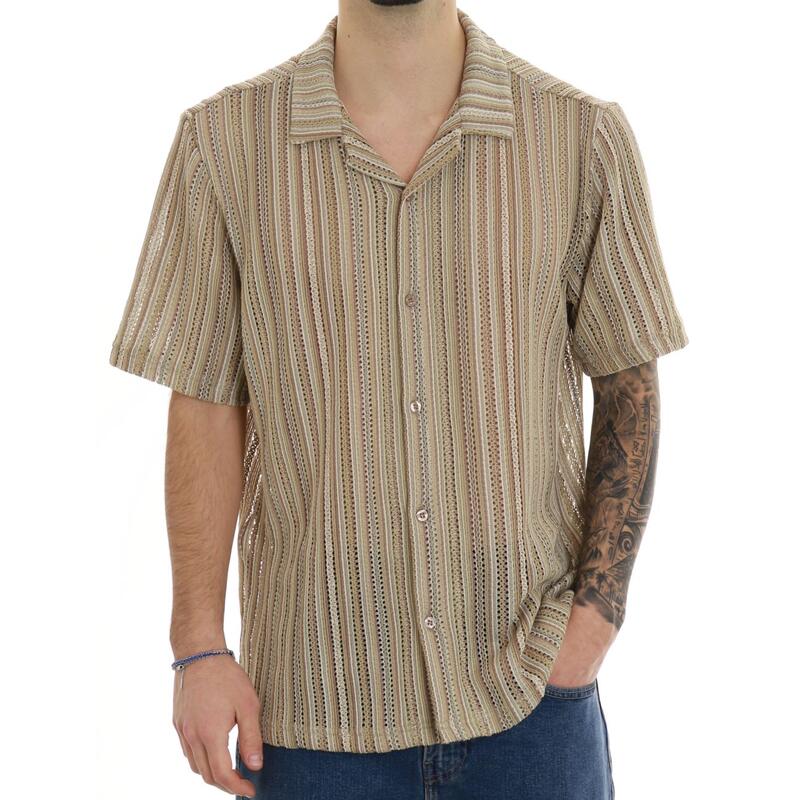 Camicia a maniche corte in fantasia bicolore traforata, collo bowling. Vestibilità regular.