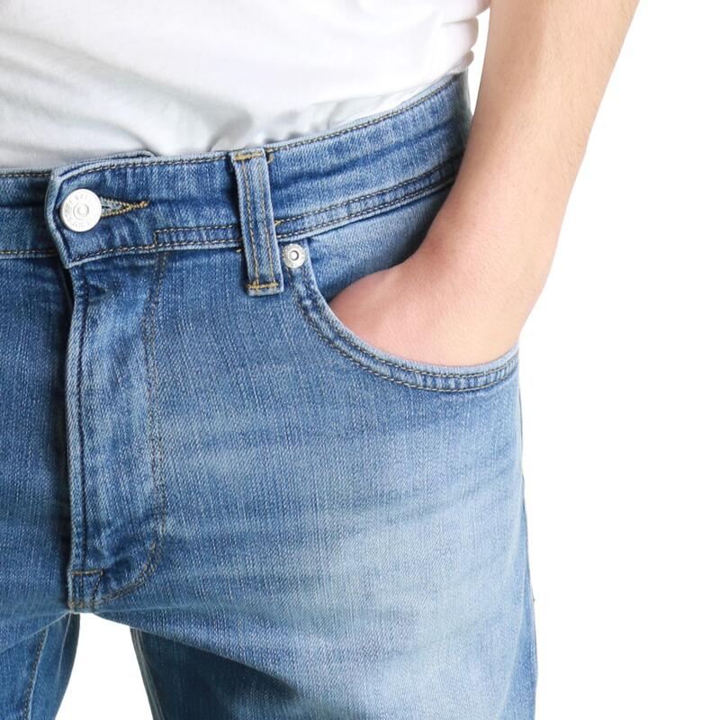 Jeans stretch lavaggio chiaro, vita media, salpa a contrasto, chiusura con bottone e zip. Vestibilità slim.