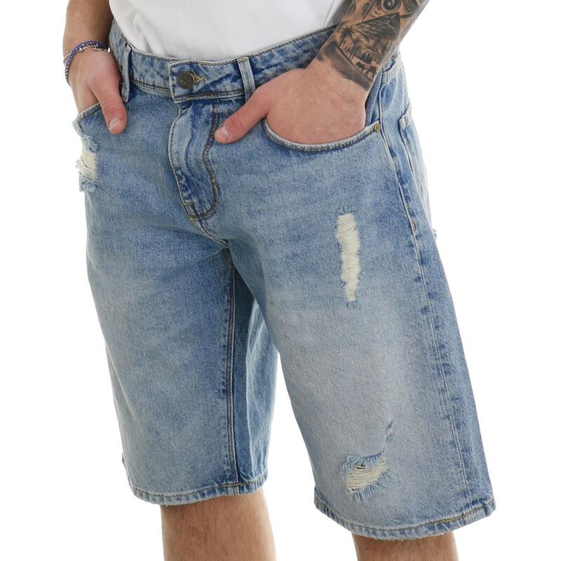 Pantalone corto in denim, finiture destroyed, lavaggio chiaro, chiusura con bottoni. Vestibilità regular.